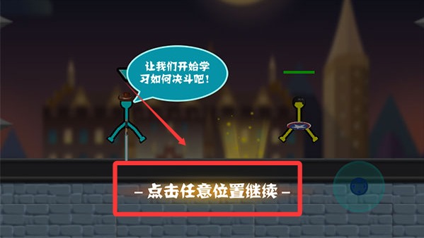 1、進(jìn)入游戲后先熟悉一下操作,點(diǎn)擊屏幕任意位置繼續(xù)。