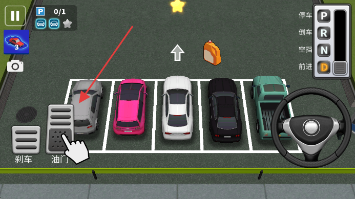3、調(diào)整方向,駕駛白色車輛駛?cè)肽繕?biāo)車位,完成停車挑戰(zhàn)。