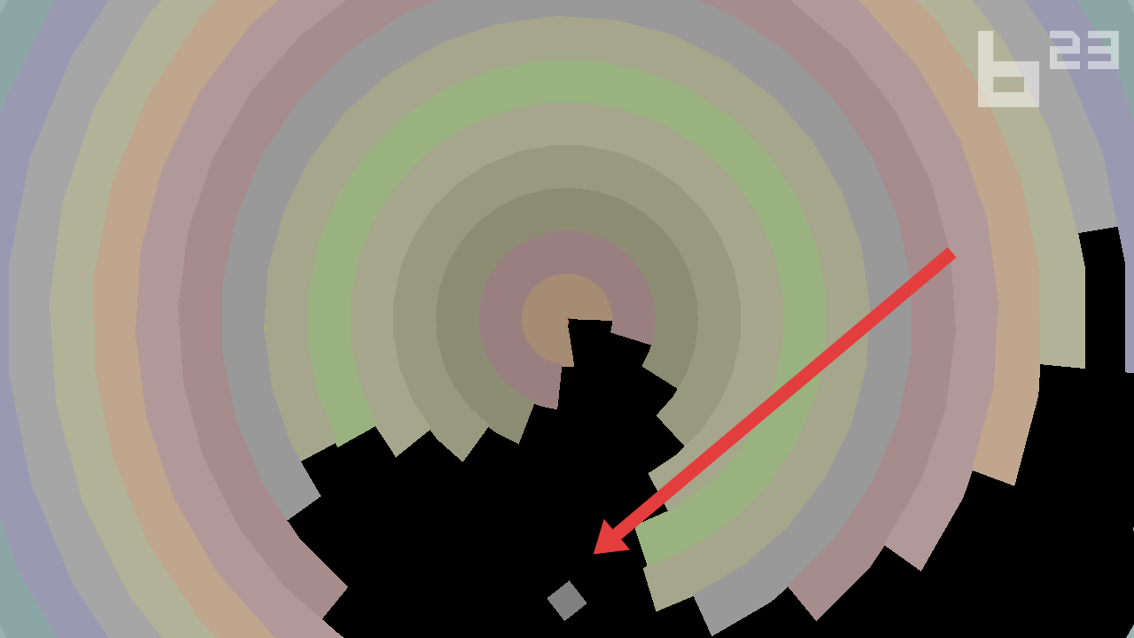 3、在高速螺旋的游戲中,操控黑色不規(guī)則圖形,移動并觸碰箭頭指向的灰色方塊,完成關(guān)卡目標。