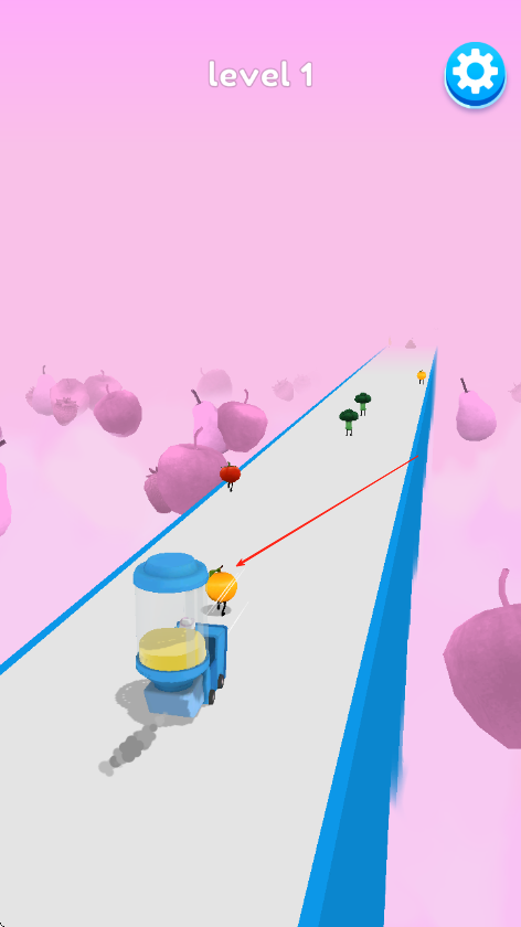1、進入游戲后操控榨汁車在初始賽道行駛,左右滑動屏幕躲避障礙物,追上前方奔跑的水果蔬菜,點擊屏幕釋放榨汁功能將其收集。