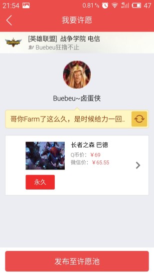 道具許愿:許愿你心儀的游戲道具,分享給好友讓他們幫你買單。你還可以給游戲好友直接贈送道具哦。