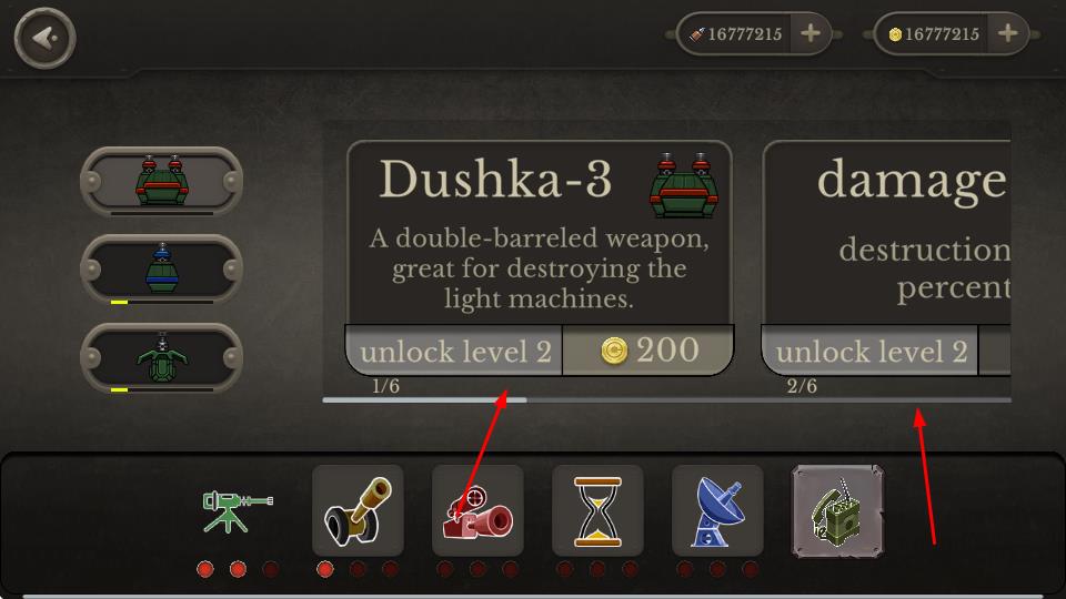 1、進入武器界面,消耗金幣(200)解鎖Dushka-3等武器2級,提升塔樓攻擊能力。