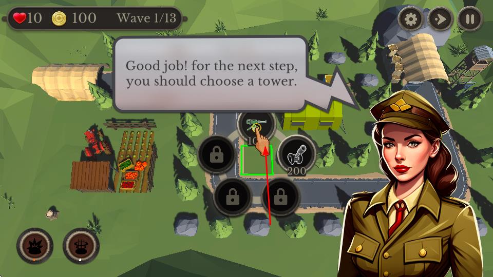 2、關(guān)卡中根據(jù)提示,花費金幣選擇并部署塔樓到路徑,構(gòu)建防御體系,抵御敵人進攻。