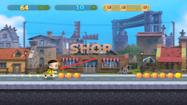 3、跑酷操作:在道路上,避障礙、吃金幣,用“急速沖刺”道具,沖高分、贏獎勵。
