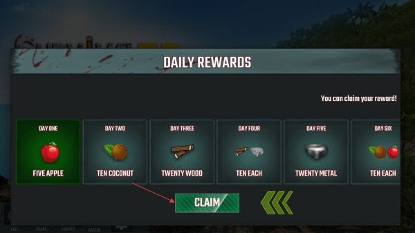 1、獎(jiǎng)勵(lì)領(lǐng)取:點(diǎn)“DAILY REWARDS”→“CLAIM”,領(lǐng)蘋(píng)果、椰子等每日物資。