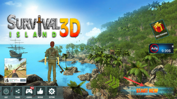 2、開(kāi)局探索:點(diǎn)“START NEW”,在海島場(chǎng)景,持工具(如斧頭),采資源、造工具。