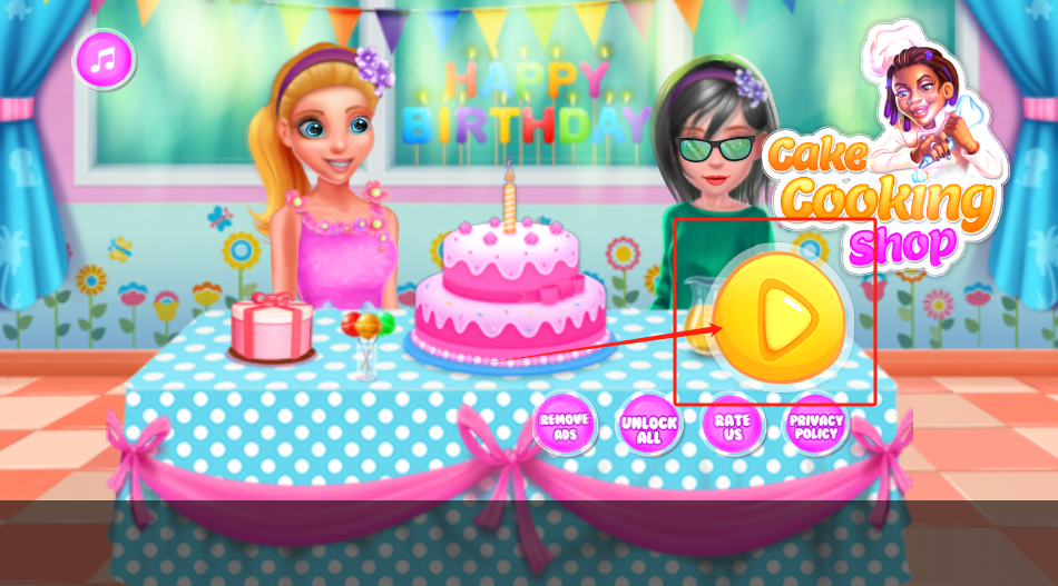 1、點(diǎn)CAKECOOKINGSHOP開始游戲,看桌上蛋糕和禮物,女孩在等,別管右邊按鈕。