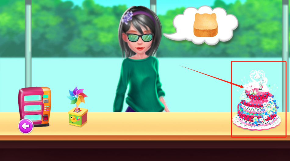 2、戴墨鏡女士要蛋糕,點(diǎn)紅框里的三層蛋糕給她,桌上機(jī)器和風(fēng)車先不管。