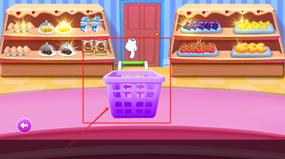3、紅箭頭指紫色籃子是要買的,點(diǎn)它買面粉,貨架其他東西先不用拿。