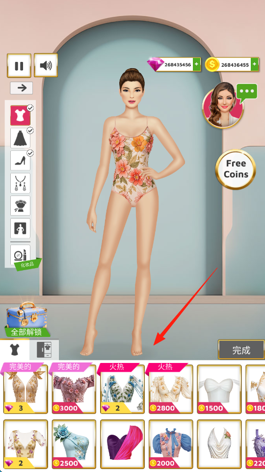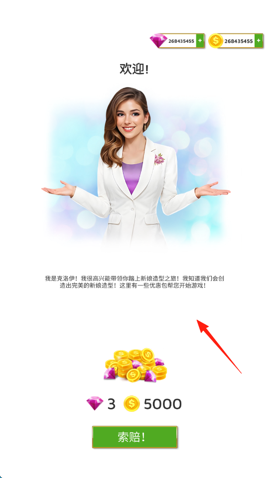 1、進入界面后點擊箭頭處,跟隨指引了解游戲,用初始資源開啟新娘造型設計之旅。