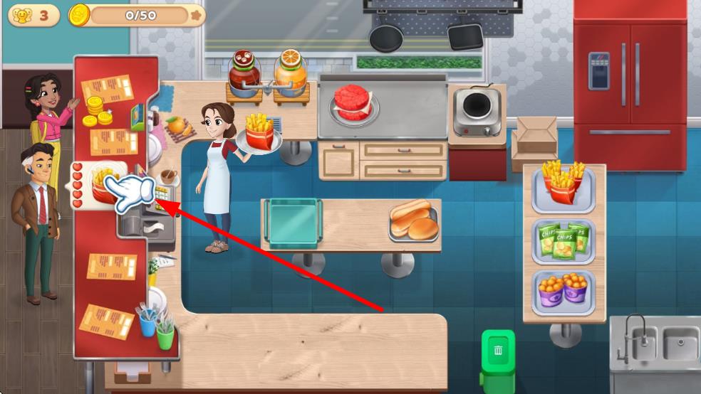 2、在廚房區(qū)域,按提示操作,使用相應食材和廚具制作菜品,完成后交付給顧客,獲取金幣和經驗值。