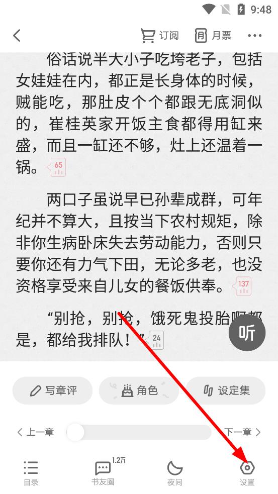 1、在起點(diǎn)讀書APP中打開要閱讀的書籍,進(jìn)入閱讀界面,點(diǎn)擊屏幕右下角的設(shè)置按鈕。