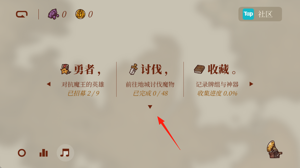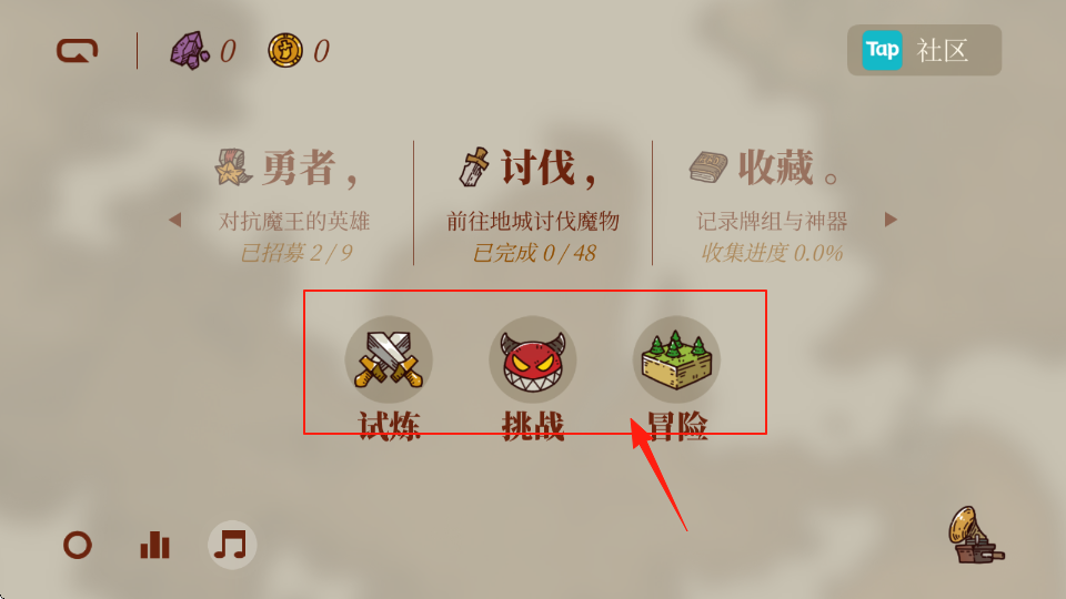 3、登錄游戲,先看“勇者”“討伐”“收藏”進(jìn)度,從“討伐”入口選玩法開(kāi)啟魔城冒險(xiǎn)。