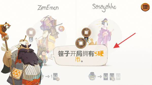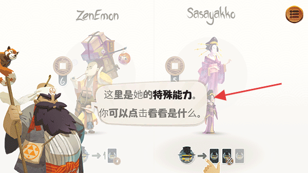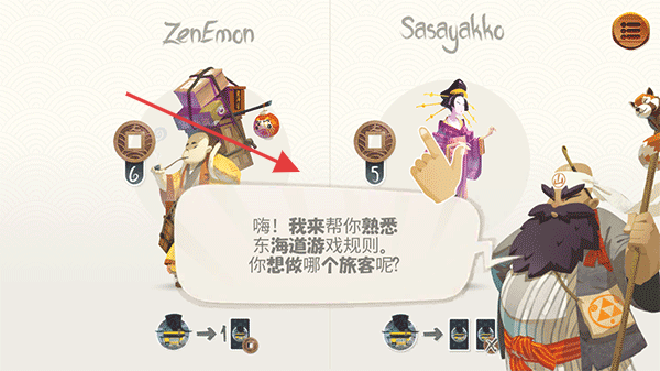 1、開局選“ZenEmon”“Sasayakko”等旅客角色,了解其初始硬幣、特殊能力后開始游戲。