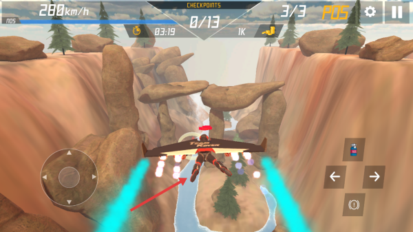 2、操控飛行競速:比賽中通過操控設(shè)備調(diào)整飛行方向與高度,合理使用噴氣加速功能,在保持高速的同時(shí)避開障礙,全力向終點(diǎn)沖刺超越對(duì)手。