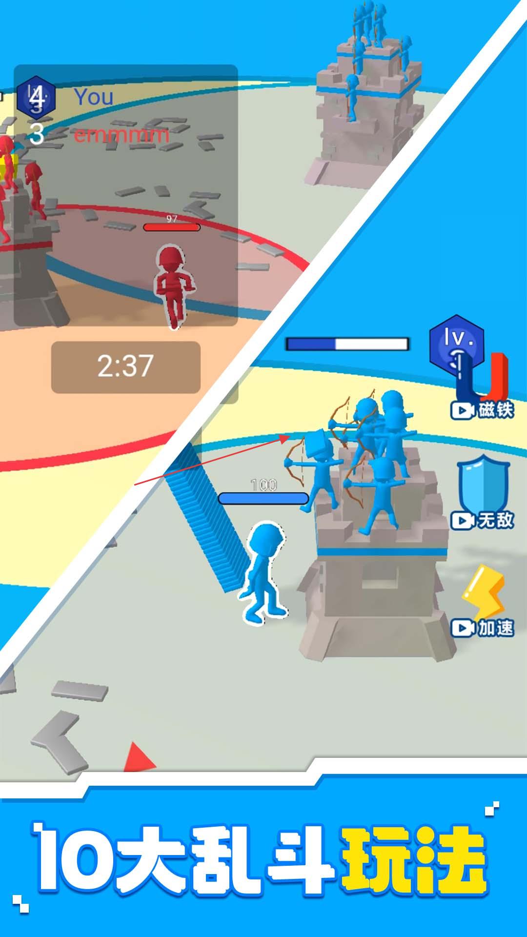 3、關(guān)卡多樣任務(wù)各異:包含大量厲害的挑戰(zhàn)關(guān)卡,每個(gè)關(guān)卡的任務(wù)各不相同,從爭(zhēng)奪磚塊到守衛(wèi)城堡,從競(jìng)速挑戰(zhàn)到敵人圍剿,多樣化的任務(wù)避免玩法單調(diào),讓玩家始終保持新鮮感。