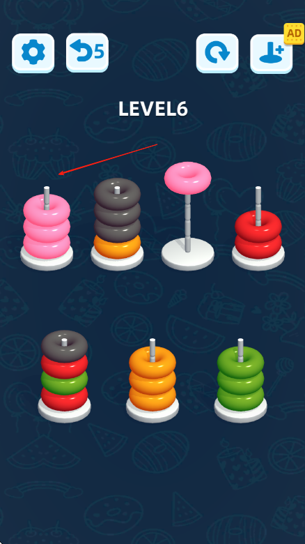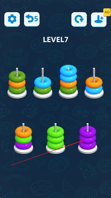 1、分層拆解策略:面對多層圈環(huán)時,先從底層大圈開始分析顏色歸位路徑,例如將目標顏色的底層大圈先移動到目標支柱,再逐步處理其上方的中圈和小圈。