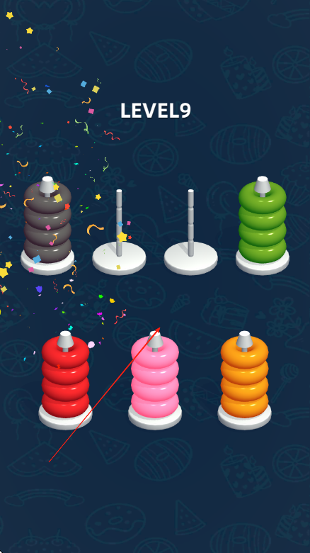 2、移動時嚴格遵守“大圈不可置于小圈上方”的規(guī)則,若目標支柱頂端圈環(huán)更小則無法放置。可先將非目標顏色的圈環(huán)暫存到臨時支柱,為同色圈環(huán)的堆疊騰出空間。