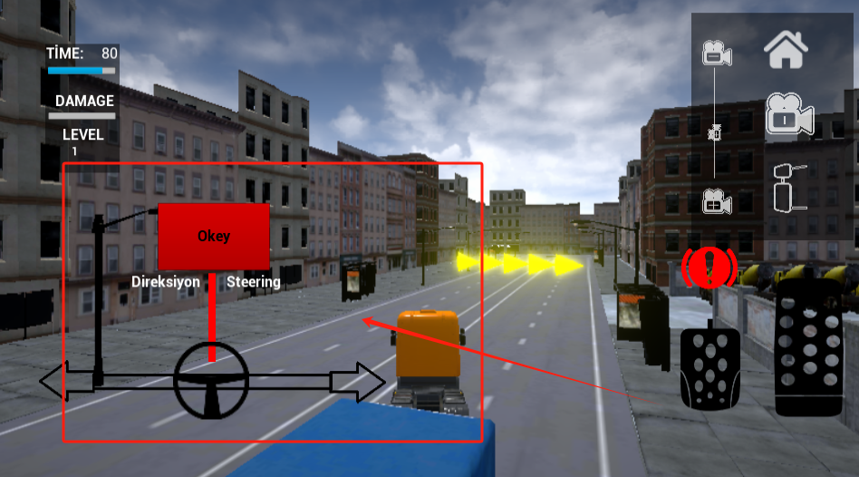 2、跟著黃色箭頭開車,注意時(shí)間別超時(shí),小心別撞車增加損傷值。