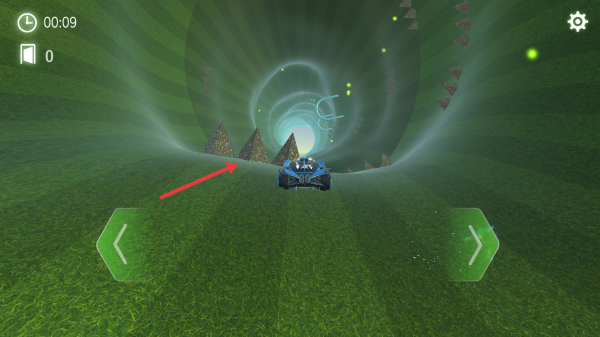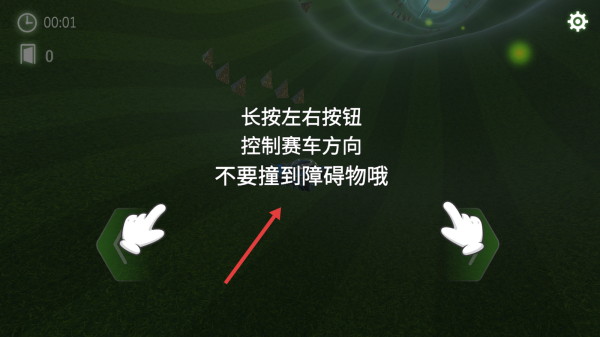 3、操控左右綠色箭頭按鈕,控制賽車方向,躲避賽道上的三角障礙物,朝著隧道方向行駛,順利通過(guò)關(guān)卡。
