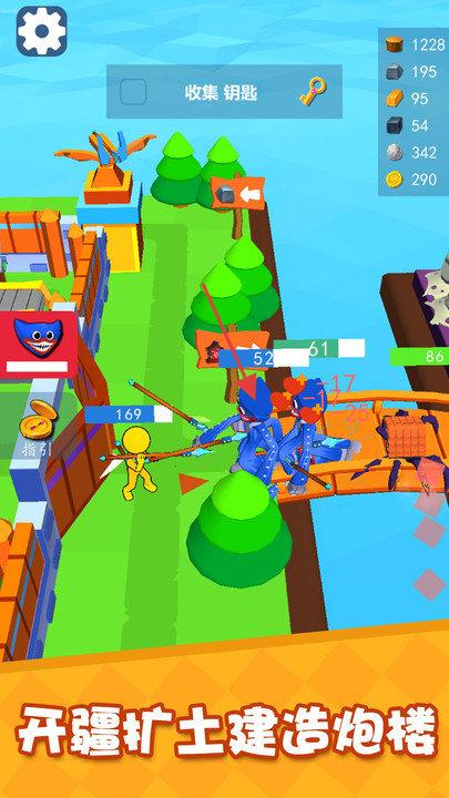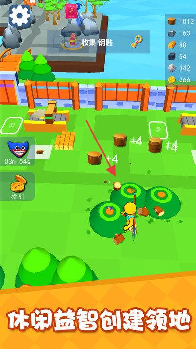 1、操控角色“開疆?dāng)U土”,在地圖探索,收集木材、石頭等資源,用于“建造炮樓”,防御領(lǐng)地。