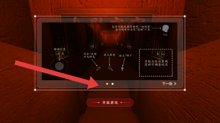 2、教程頁點擊“開始游戲”(箭頭指向),確認(rèn)操作指引(移動、交互等),進(jìn)入密室場景,準(zhǔn)備解謎。