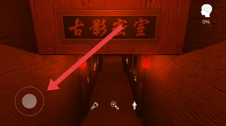 3、密室中,通過左側(cè)虛擬搖桿(箭頭指向)控制角色移動,探索“古影密室”區(qū)域,尋找線索、解開謎題,推進(jìn)游戲劇情。