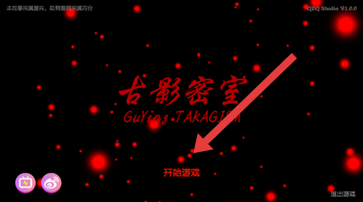 1、主界面點擊“開始游戲”(箭頭指向),進(jìn)入《古影密室》,開啟恐怖密室解謎冒險。