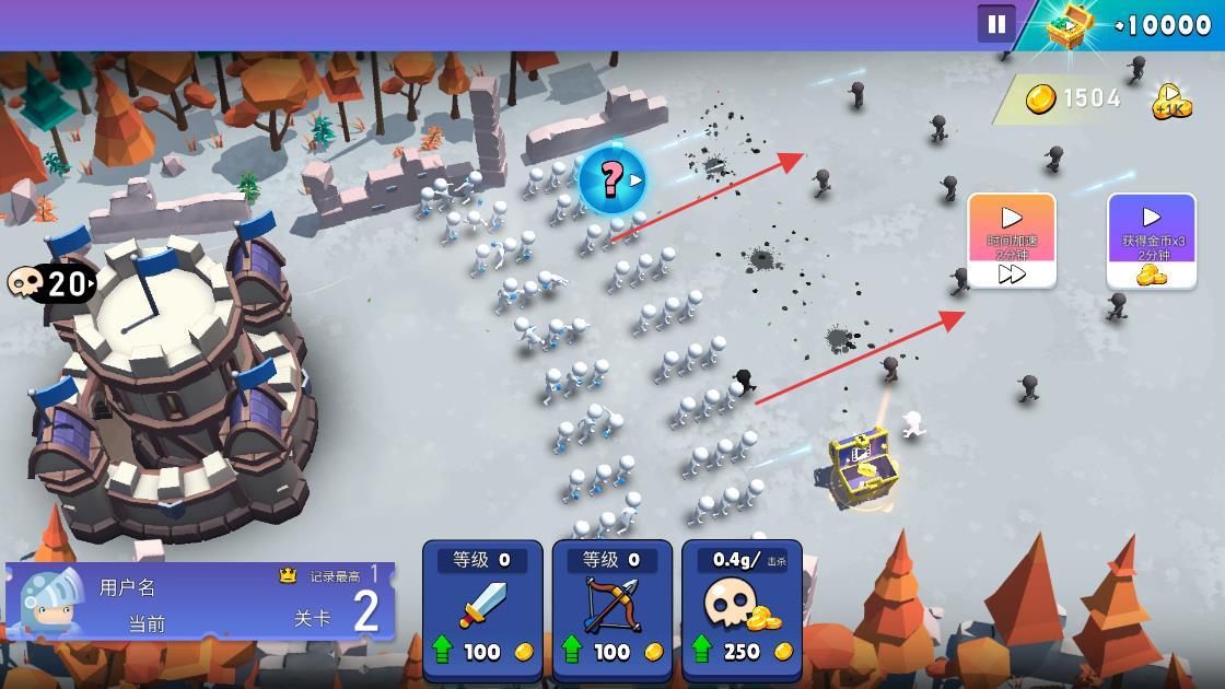 2、消耗金幣“升級兵種”(劍、弓、骷髏),提升戰(zhàn)力,應(yīng)對關(guān)卡敵人(黑色火柴人)。