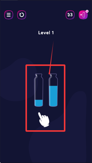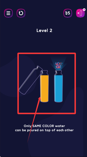 1、玩家需要精準(zhǔn)判斷顏色屬性,將相同顏色的液體倒入對應(yīng)容器,同時注意目標(biāo)容器的剩余容量限制。