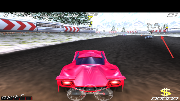 3、比賽時(shí)操控粉色賽車,在雪地賽道上行駛,注意彎道漂移(看【DRIFT】條),趕超對(duì)手,沖向終點(diǎn)贏取獎(jiǎng)勵(lì)。