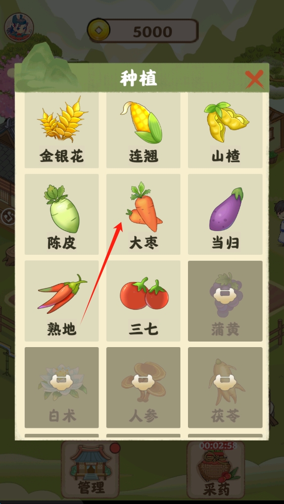 2、點擊管理,注意收集限時藥材種子,可能用于解鎖特殊配方,利用每日登錄獎勵獲取免費種植加速與稀有種子。