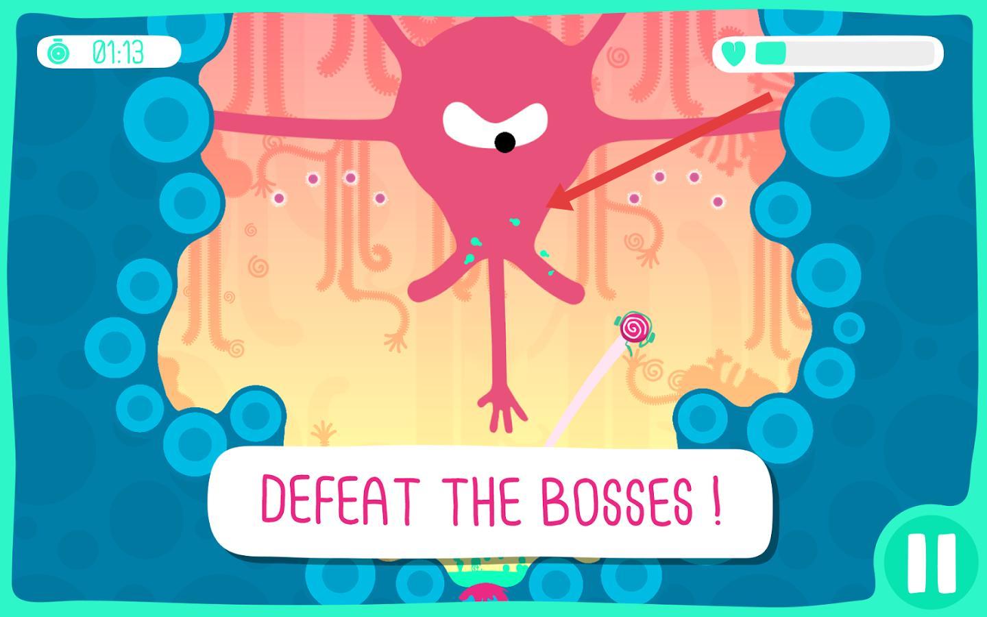 2、遭遇boss關(guān)卡,依據(jù)“DEFEAT THE BOSSES”提示,操控武器攻擊粉色怪物,把握攻擊節(jié)奏擊潰首領(lǐng)。