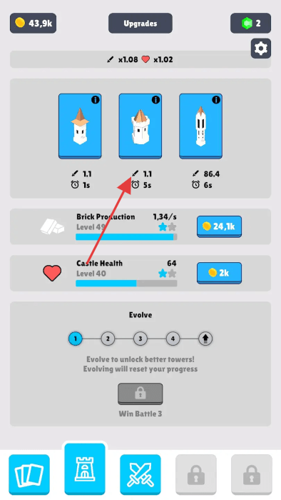 1、“塔樓升級”,在Upgrades界面,消耗金幣(43.9k),提升塔樓(傷害、攻速)與城堡血量。