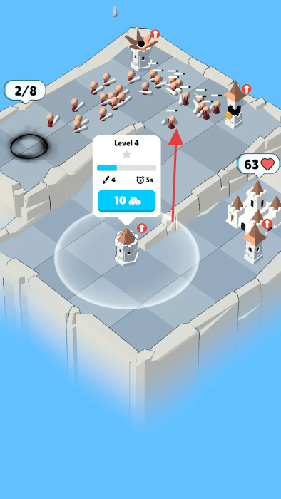 3、持續(xù)升級應對浪潮:隨著敵人浪潮越來越強,需及時升級防御塔增強戰(zhàn)力,從基礎攻擊到特殊效果逐步解鎖,讓防御能力與敵人強度同步提升,在無盡的敵人進攻中堅守城堡。