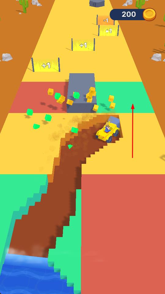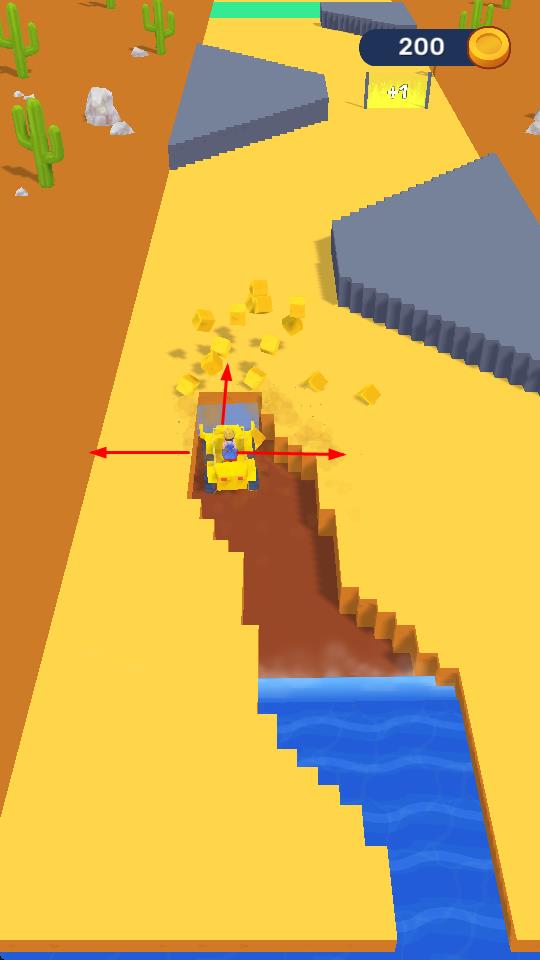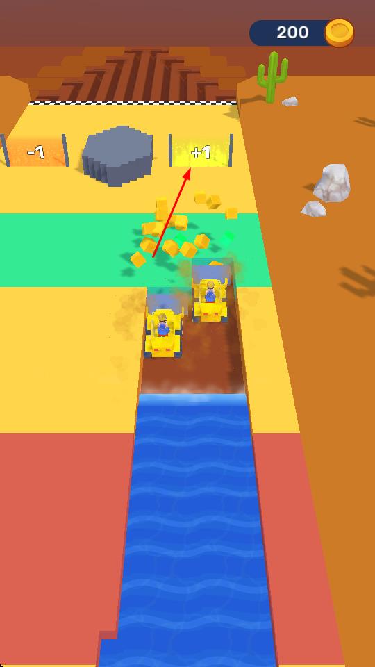 1、“挖礦車行駛”,操控黃色挖礦車沿沙漠路徑前進,左右移動避開障礙(石頭、河道)。