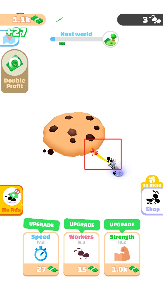 1、規(guī)劃蟻群發(fā)展:分配工蟻負(fù)責(zé)食物采集、蟻巢修繕,派遣兵蟻進(jìn)行巡邏與戰(zhàn)斗,通過放置機(jī)制讓蟻群自動完成基礎(chǔ)工作,玩家則專注于升級螞蟻種類、優(yōu)化資源分配。