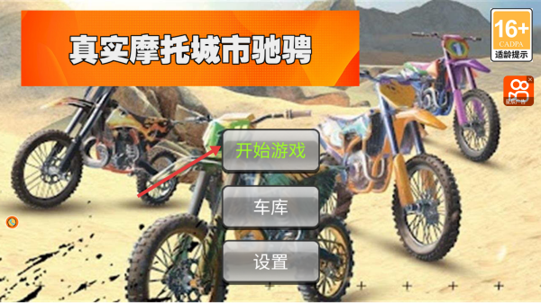 1、點擊主界面【開始游戲】,進入《真實摩托城市馳騁》,選定摩托,開啟城市騎行挑戰(zhàn)。