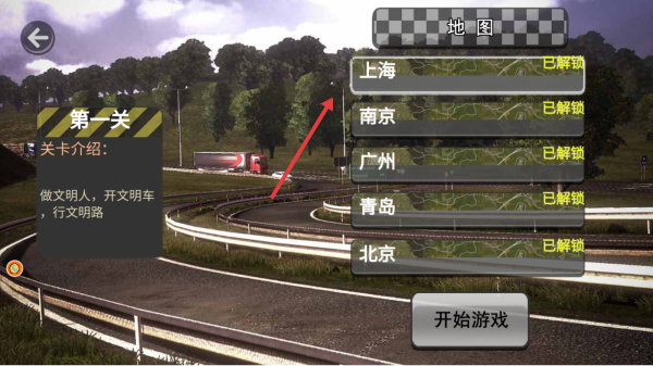 2、在關(guān)卡選擇,選【上海】地圖(已解鎖),點擊【開始游戲】,進入上海賽道,準備騎行。