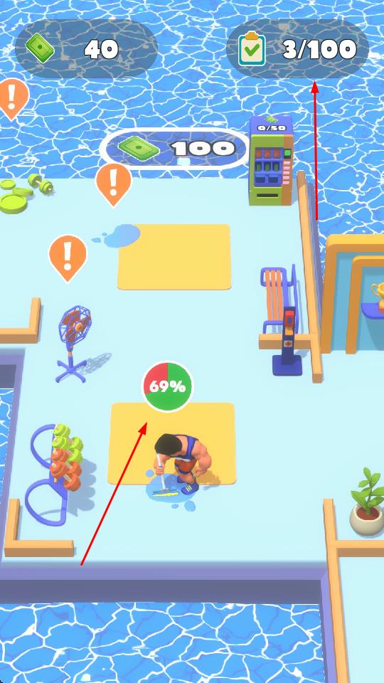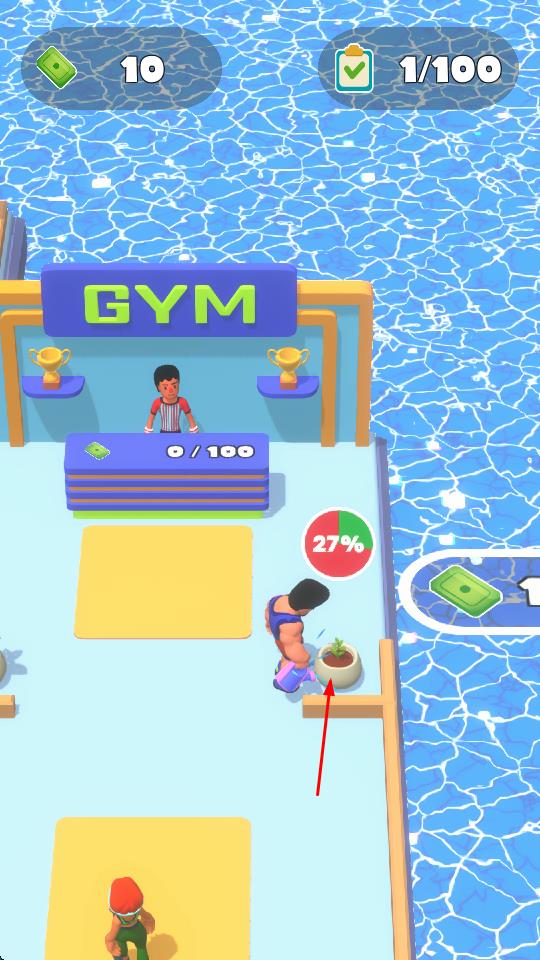 1、“健身房經(jīng)營”,操控肌肉男角色,在泳池邊健身房區(qū)域,完成澆水、清潔等互動任務。