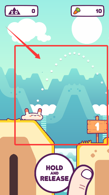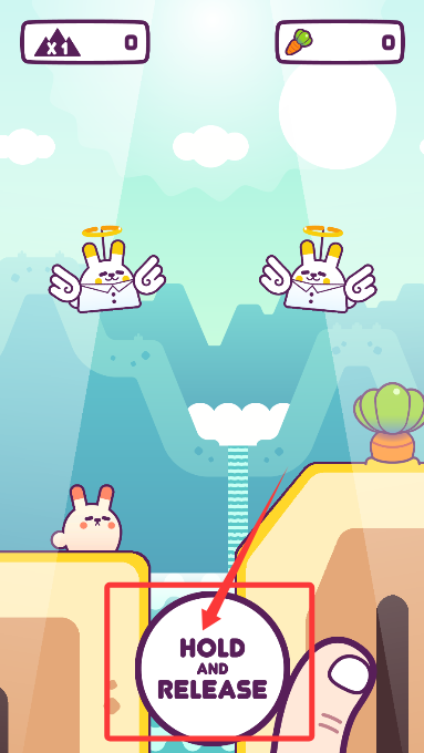 1、啟動(dòng)游戲程序,按住屏幕中央"蓄力釋放"鍵位,待能量充滿后松手觸發(fā)兔子跳躍。