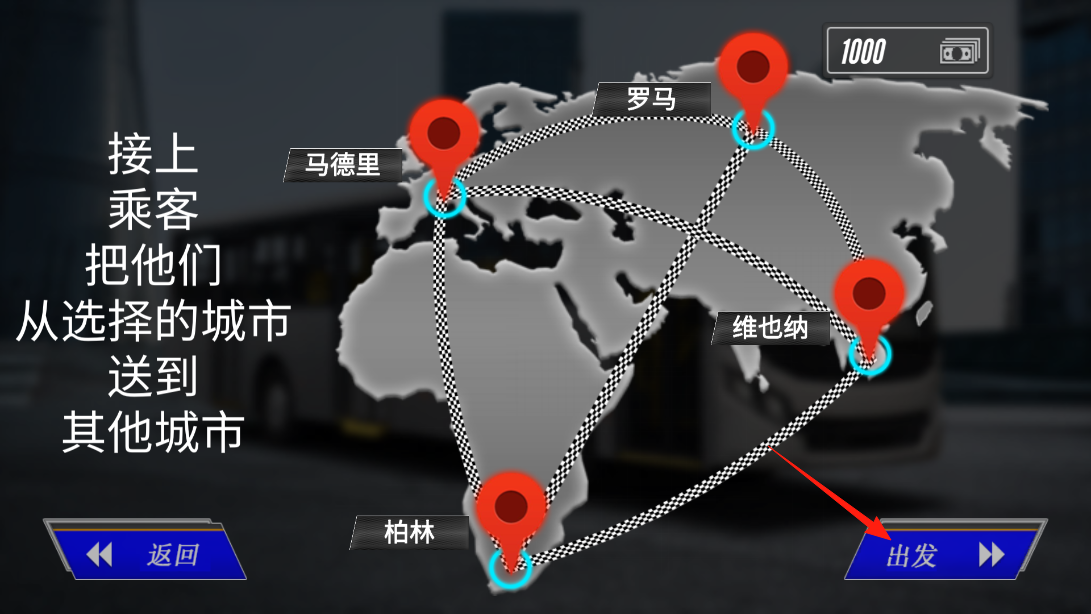 3、在城市地圖界面,依據(jù)提示“接上乘客,送往其他城市”,點(diǎn)擊“出發(fā)”,選定運(yùn)輸路線,借城市聯(lián)運(yùn)機(jī)制,駕駛巴士穿梭于不同城市間,完成乘客接送,體驗(yàn)長(zhǎng)途運(yùn)輸?shù)牟呗酝娣ā?
