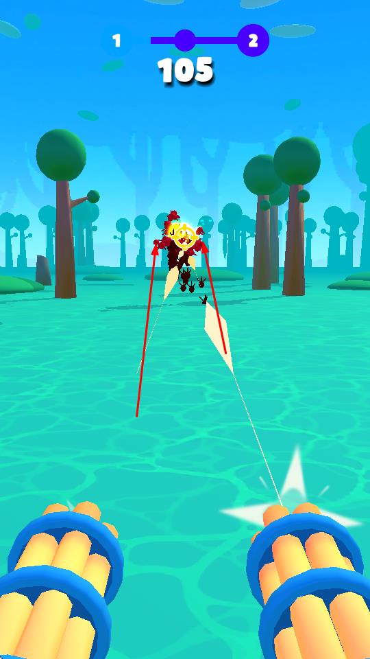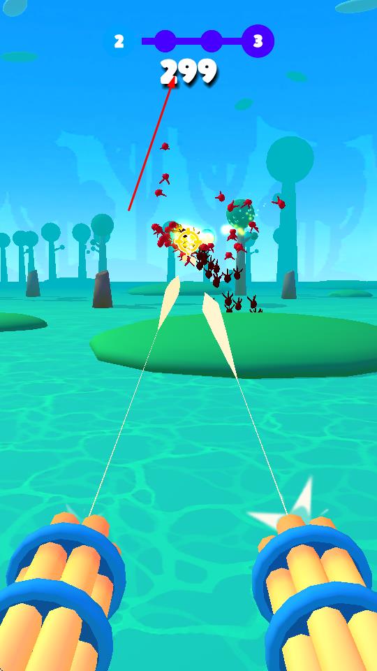 1、“箭矢射擊”,在森林場景操控雙管發(fā)射器,發(fā)射箭矢,瞄準紅色目標,擊中增加箭矢數(shù)量。