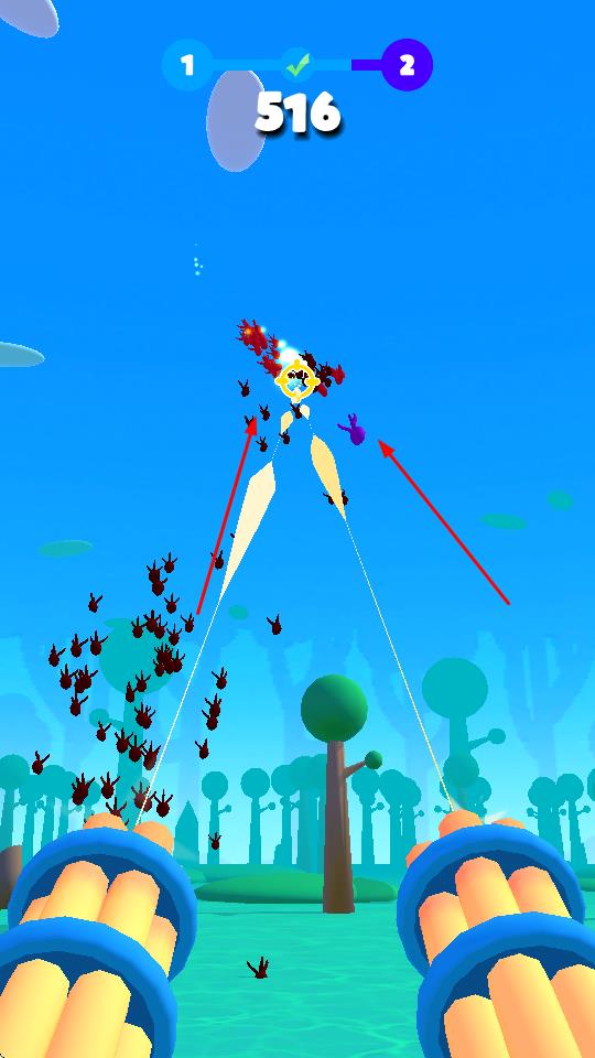 2、“數(shù)量積累”,連續(xù)擊中目標,積累箭矢數(shù)量(105→516→299),提升射擊效率,應對復雜關(guān)卡。