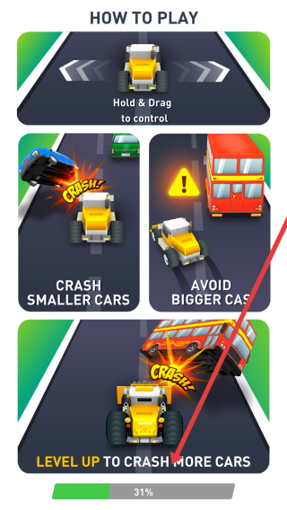 1、在玩法指引頁(yè),了解“Hold&Drag”操控、“CRASH-SMALLER-CARS”“AVOID-BIGGER-CARS”規(guī)則,升級(jí)解鎖更多撞車權(quán)限。
