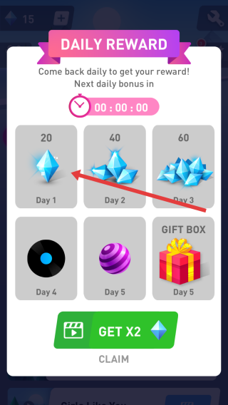 2、進(jìn)入每日獎(jiǎng)勵(lì)界面,首日可領(lǐng)“20鉆石”,后續(xù)連續(xù)登錄獎(jiǎng)勵(lì)遞增,點(diǎn)擊【CLAIM】或看廣告雙倍獲取,積累鉆石資源。
