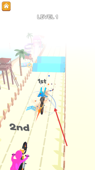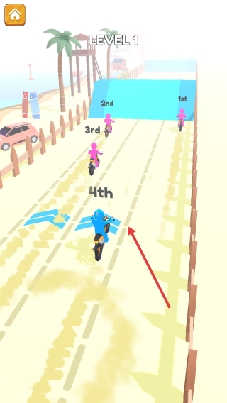 2、駕駛時,沿道路前行,超粉色摩托,借藍(lán)色加速帶,提升速度,爭取名次。
