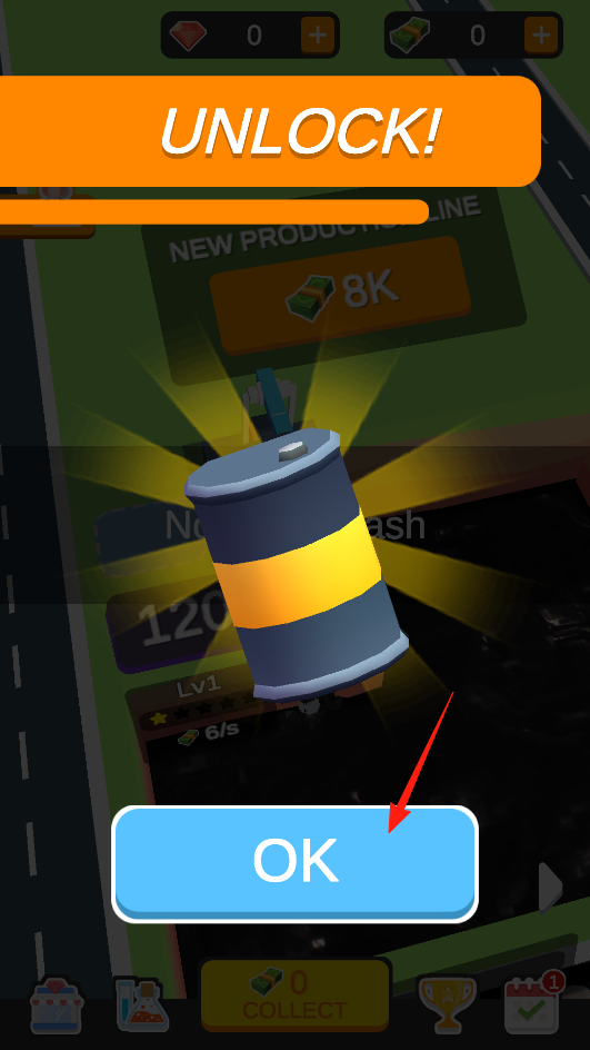 3、產(chǎn)線建造完成后,彈出“UNLOCK!”提示,點(diǎn)擊“OK”確認(rèn),借解鎖反饋機(jī)制,完成新產(chǎn)線啟用,回到主界面可使用新增產(chǎn)能,體驗(yàn)成就感與玩法拓展的銜接。