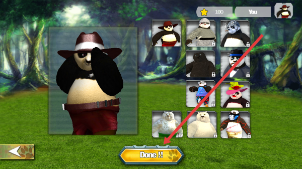 1、在角色選擇頁,選定熊貓角色(戴牛仔帽造型),點擊【Done!!】,確認(rèn)角色進(jìn)入游戲主界面。