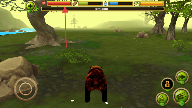 1、進入動物模擬游戲,觀察上方生命、飽腹等狀態(tài)條。